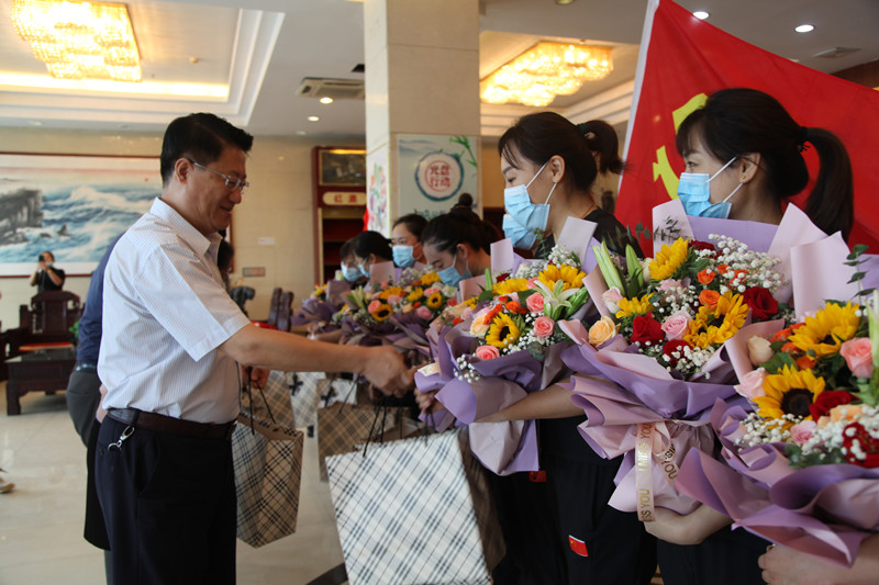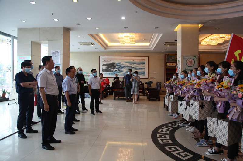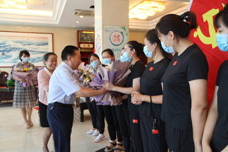 27日早上8點,12名抗疫隊員們穿著貼有國旗標(biāo)識的統(tǒng)一服裝,高舉著鮮紅的黨旗,懷著激動的心情列隊等候在大廳,李曉東董事長、姜巖總經(jīng)理與她們一一親切握手、問候,親手送上鮮花與禮盒,并與她們合影留念。