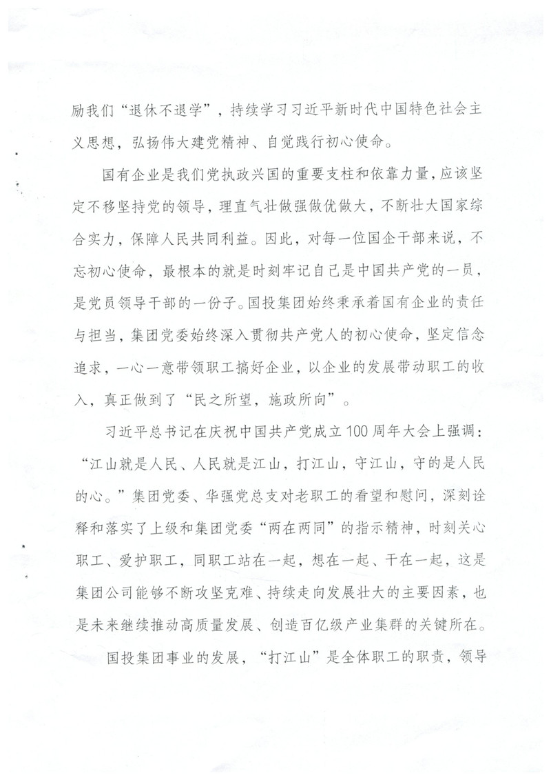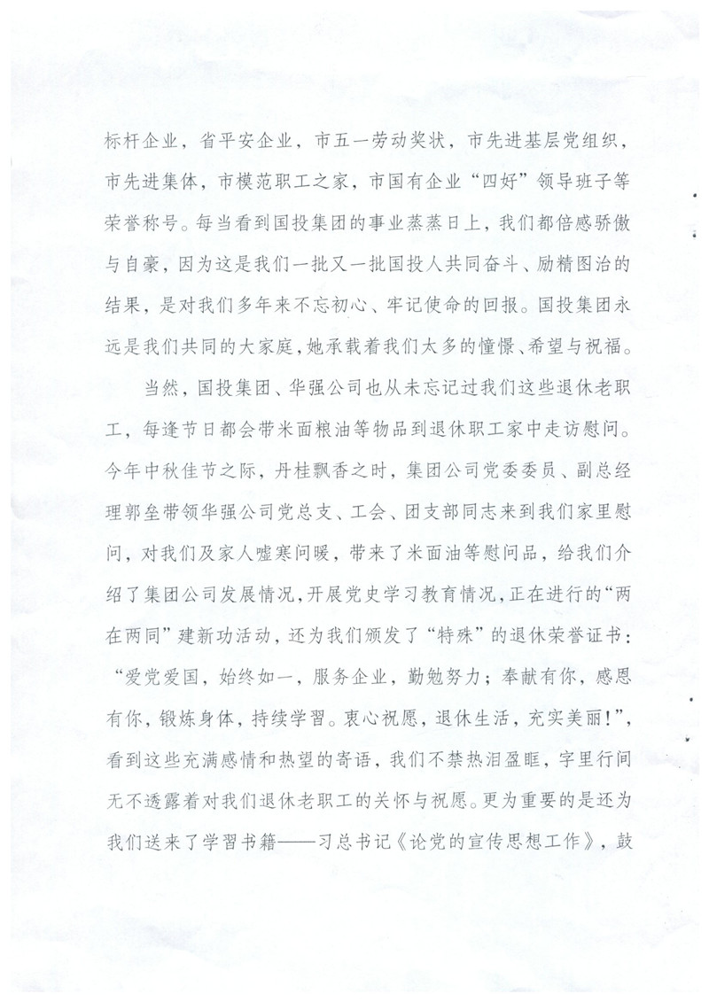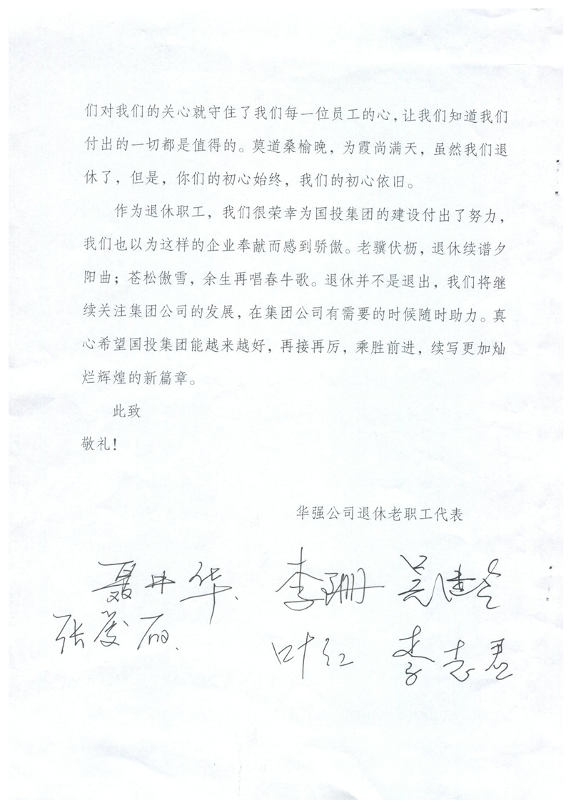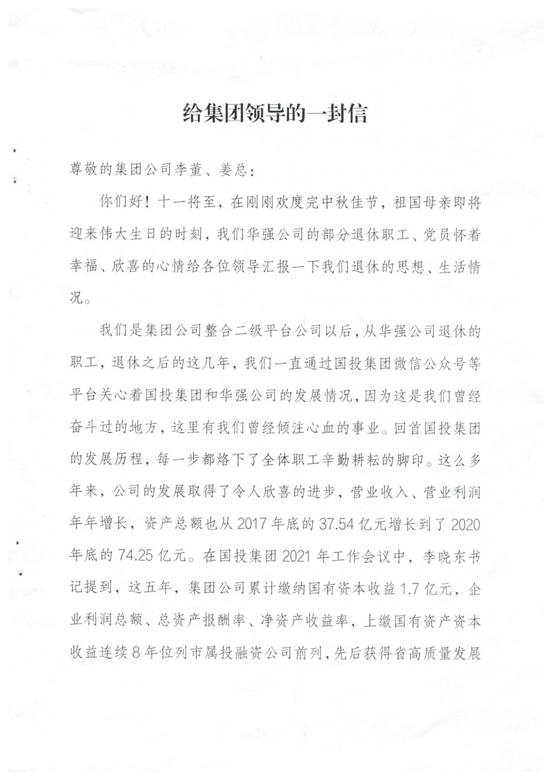 您們好!來信收悉。在中秋佳節(jié)之后,國慶即將來臨之時,收到老同志們的來信,倍感親切,老同志們退休不退出,一直關心支持國投集團改革發(fā)展情況并積極建言獻策的精神讓我們感動,正是由于像您們一樣的徐州國投老同志們的無私奉獻和精神感召,全集團2000余名在崗職工勤勉履職,愛崗敬業(yè),開創(chuàng)了徐州國投來之不易的發(fā)展成績,我們表示非常感謝,并向您們和國投集團全體退休老同志致以誠摯的問候!